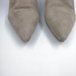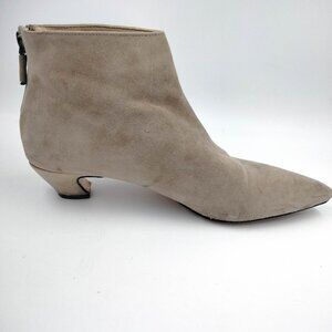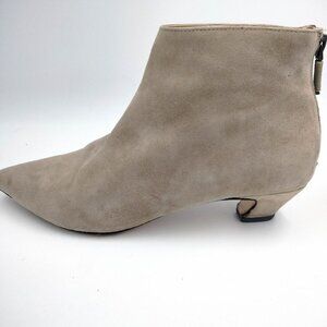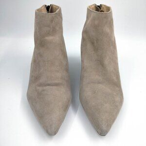 Tan/beige suede kitten heel ankle boots with side zippers.