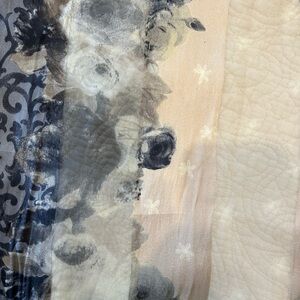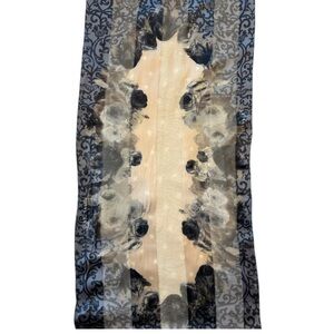 Christian Dior scarf, designed by John Galliano, featuring a blue and gray floral and striped pattern with beige borders. These types of scarves, often made of silk or other fine materials, were popular during Galliano's tenure as creative director for Dior, which lasted from the late 1990s to the early 2010s. They frequently incorporated bold prints and patterns, reflecting the designer's theatrical and avant-garde aesthetic. These scarves are considered vintage
