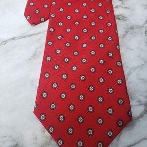 This red Tie by Dior will add a confident feeling to your formal or office wear. Tie is red with blue circular pattern over it Tie has been used but is in great condition.