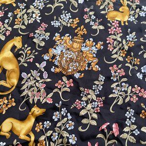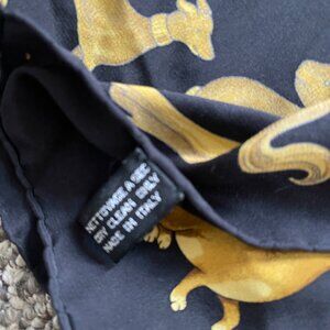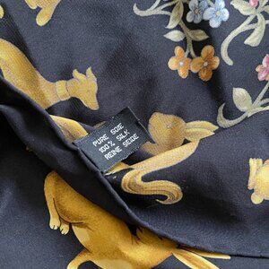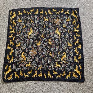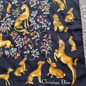 Beautiful silk scarf from Christian Dior. Made in Italy. Navy background with unicorn and animals and floral motif. Measures 33" x 33". In excellent condition.
