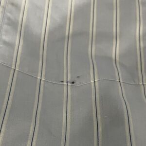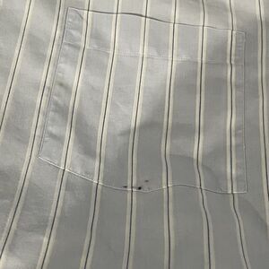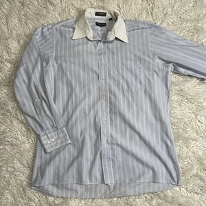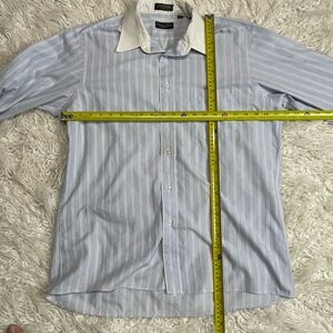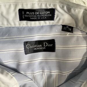 The product is a Christian Dior Men's Dress Shirt in blue, featuring a Monsieur vertical striped pattern. This size 16 shirt with a regular fit and long sleeves is designed for men who prefer a classic and sophisticated style. Made by the renowned designer brand Dior, this dress shirt exudes a sense of luxury and high-end fashion with its timeless design and premium quality construction. Perfect for formal occasions or adding a touch of elegance to any outfit, this shirt is a versatile and stylish addition to any man's wardrobe.