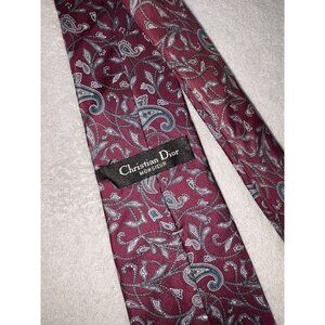 This is a luxury men's necktie by Dior, made of 100% silk in a cranberry color. The tie is part of the Monsieur collection, known for its high-quality craftsmanship and elegant design. This tie is perfect for adding a touch of sophistication and style to any formal or business attire. The fabric is woven from Italy and the tie was made in the USA.