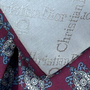 Elevate your style with this vintage Christian Dior silk tie. The burgundy, cream and blue paisley pattern, made with fabric woven in Italy, adds a touch of luxury to any outfit. This classic tie measures between 57-60 inches in length and has a classic width. Width 3.5" . Perfect for any occasion, this designer tie is a must-have for any fashion-forward man. The high-quality 100% silk material ensures durability and long-lasting wear. Don't miss out on this opportunity to add a classic piece to your wardrobe.