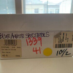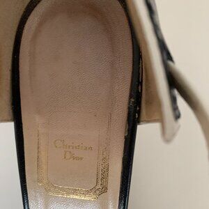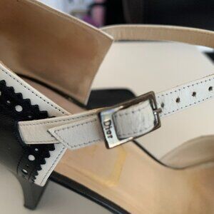 These designer heels are gently worn. They are stylish Christian Dior navy and white ankle-strap spectators designed with a sophisticated woman in mind! The beautiful spectator detail, Dior logo on the silvertone buckle and trendy pointy toe and unique wider heel are super stylish! They have a 3-inch heel and the soles show slight wear but the rest of the shoes are unflawed. Size 10 ½ medium. Come in original box from a smoke-free home. Original purchase price was $370.