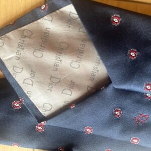 Christian Dior Navy Scarf with Red Circles 95% polyester 5% Silk