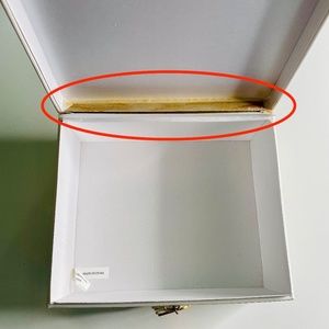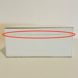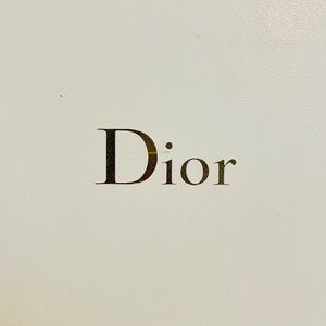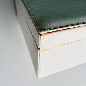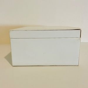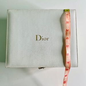 Christian Dior Parfums White Faux Leather "D" Charm Empty Storage Gift Box. Exterior is off-white vinyl with gold Dior on top and D charm on front. Made in China by Parfums Christian Dior. Approximate exterior measurements: 9 inches length x 7.5 inches width x 4 inches height. I've owned this for 10-15 years and used it to store neck ties. Box is preowned vintage and in fair condition - noticeable marks/signs of wear and material loss on the back crease, glue has turned brown from age, interior crease area has detached and needs to be re-glued.