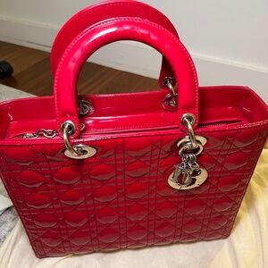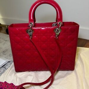 This is an authentic CHRISTIAN DIOR Patent Cannage Large Lady Dior in Red. This chic tote is crafted of geometric quilted patent leather in dark cherry red. The bag features strong top handles, and silver hardware including a Dior initial charm.