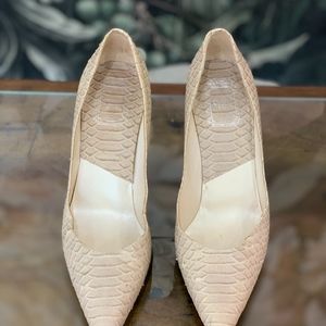 This delicate python pump is roughly a 90 Millimeter (3") heel that is super wearable and comfortable. Very little wear and tear.