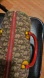 Stylish designer handbag featuring a brown pattern with vibrant red and yellow accents. Perfect for adding a pop of color to any outfit.