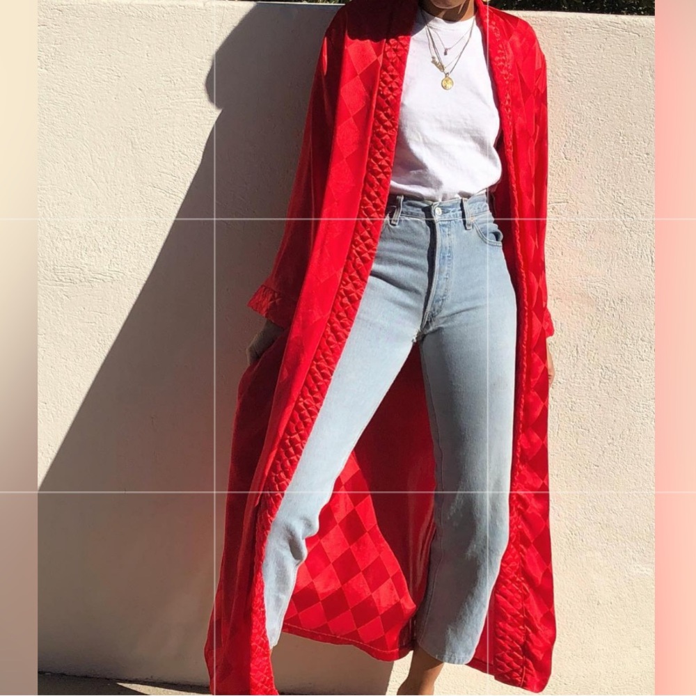 Gorgeous Satin cherry red Christian Dior kimono robe with diamond print and quilted fabric along collar.