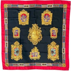 Christian Dior Silk Scarf w/ COA Baroque Frame Print– Black Red Gold– Authentic