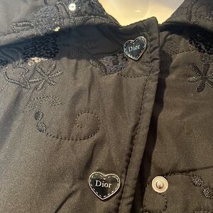 This is gorgeous Christian Dior Sz 8 Lightly Quilted Beaded Snap Closure Blazer Jacket. Lightly quilted and lined makes this jacket both elegant, dressy and warm. Beaded and stitched for a super feminine look. Two patch pockets. 5 heart shaped black enamel snap button closures. Notch collar. Sleeve length 24”, shoulder to shoulder 14”, waist 33”, full jacket length 23”, underarm to bottom of jacket 17”, hips 40”. No odors. No tears. No stains. Made in France.