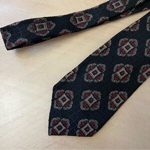 Vintage Dior skinny tie in black with a grey and red geometric pattern.