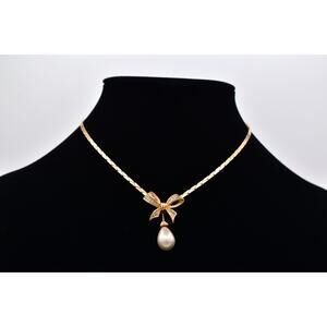 Christian Dior Vintage Bow Pendant Collar Necklace Pearl Gold Signed 1980s Bin7A