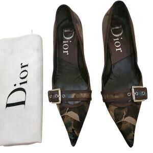 Authentic vintage Christian Dior kitten heels from the iconic John Galliano era, featuring a rare camo-floral print in rich brown and green tones. This pointed-toe silhouette captures Galliano’s early-2000s design language, blending utilitarian influence with refined femininity. The low kitten heel, sleek profile, and polished silver-tone buckle detail give these archival Dior heels a striking editorial feel while remaining wearable and elegant.
