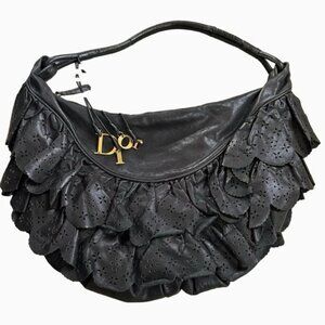 Christian Dior bag, black leather bag, hobo bag, designer handbag, ruffled purse, luxury accessory, floral design bag, fashion bag, elegant purse, Dior Gypsy, shoulder bag, leather handbag, perforated bag