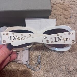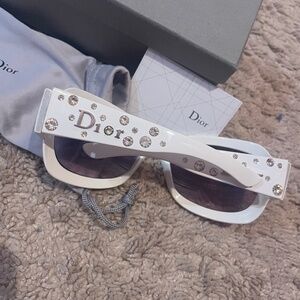 Sparkling 2 Strass Sunglasses. These stylish sunglasses have a black frame with oversized squared rims. The wide decorative sides have the Dior name in silver and Swarovski rhinestones. These are marvelous sunglasses for a one of a kind look, from Christian Dior! Pre loved and vintage!
