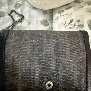 This beautiful wallet is in a great condition. No tears or rips. You can add a chain and rock it as a crossbody (I will gift one) not the one is in the pic. It has two compartments the front you can fit couple cards and coins. The back it has the click button and fits bills and credit cards. The logo is heavy and very shiny. Please ask me any question.