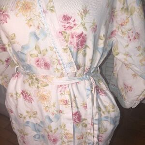 See measurement pictures. Carefully cleaned with Lysol Laundry Sanitizer and stored sealed. All Seasons. Belt loops and belt. Modesty Button. Style tag not readable but this is 💯 Cotton except for lace. Comfortable. Size is a large by the measurements 44” length. 24” arm pit to arm pit. Arm in seam is 15” for 3/2 sleeve. Crossover design. Shown on size 16 Mannequin. Measurements are approximate.