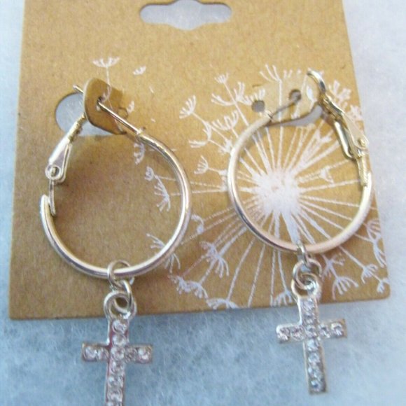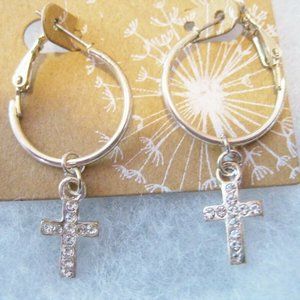 Christian Gold Tone Hoop with Rhinestones Cross Earrings