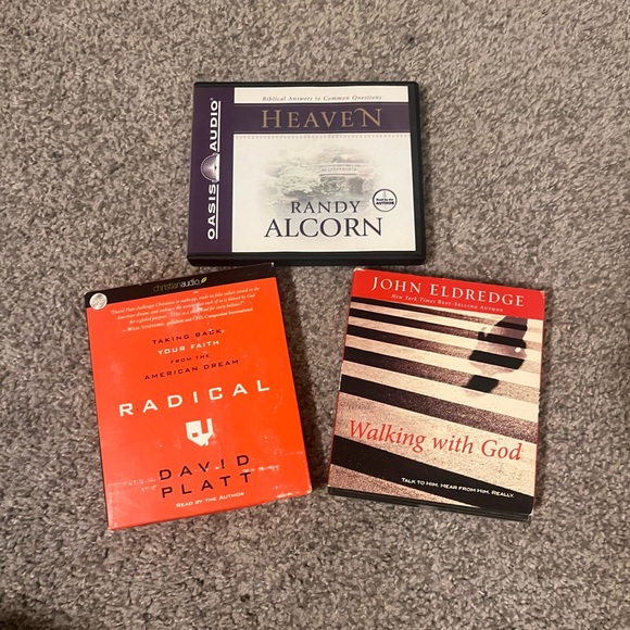 3 christian inspiration audio books by Randy Alcorn, David Platt, and John Eldridge