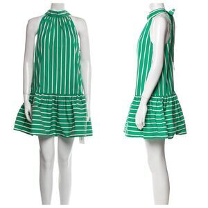 Mini Dress by Christian Lacroix in Green with White and Black Stripes. High neck that ties at back. Sleeveless. Gently worn with no visible flaws. Measurements in photos.