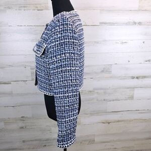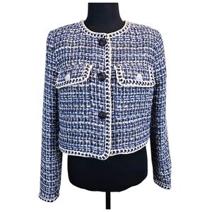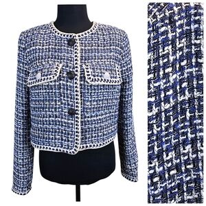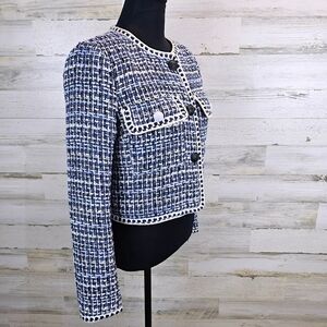 • Crafted in a luxurious blue and white tweed pattern, this cropped blazer features a sophisticated contrast trim, front flap pockets, and statement buttons for a chic, tailored fit.
