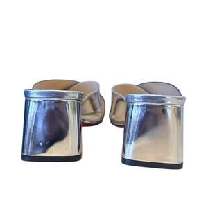 Brand new never worn, these are a striking high shine silver patent leather mule style slip on block heel sandal. Striking high shine rainbow detailing, angled squared toe and block heel. Please note, these have a few signs of "try on wear" a few scratches on left interior foot bed, and some slight scratches on the interior side of the heels and back of left shoes. Overall minor once on the foot as these give off so much shine and dimension. Let these stand out with a pair of your straight leg jeans and graphic tee or plain white top!