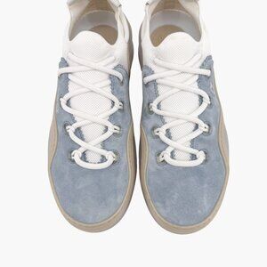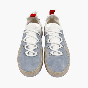These Christian Louboutin Arpoador sneakers feature light blue suede uppers with a sock-style silhouette, lace-up front, and drawstring closure at the heel. Finished with spike accents, a transparent rubber midsole, and the brand’s signature red outsole, they deliver bold designer edge with sporty comfort.