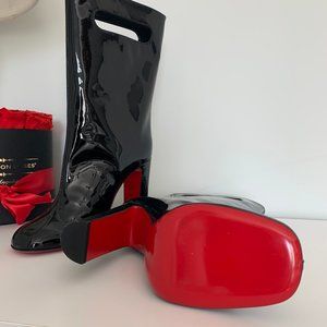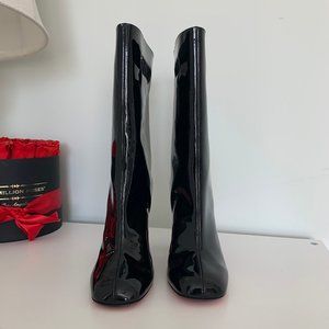 This is an authentic and brand new pair of Christian Louboutin, pull-on “Bag Bootie 100 patent-leather boots” in Black which retail for $1095. This pair is crafted from glossy Black patent-leather and set on a slim block heel. They’re finished with the label's signature red sole that's revealed with every step.