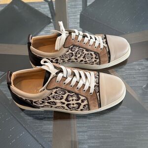 Stylish Christian Louboutin sneakers. Beige with snake print accents. Lace-up design. Perfect for casual wear.