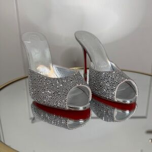 nspired by Dolly Parton, the cute and retro Me Dolly mule has been reworked with a new heel height. A stunning model with a wide, almond-shaped peep-toe construction, and Maison Christian Louboutin’s signature 100 mm 'fetish' heel. Meticulously crafted in silver suede embellished with tonal strass, which is further enhanced by a matching silver lining and specchio-effect heel.