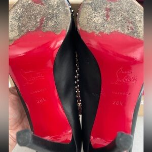 Stunning Christian Louboutin peep toe studded heels. Quality Black Leather and lined with silver metal studs. Show slight signs of wear (mostly on the bottom) which isn’t noticeable when wearing! Missing one small stud (see photos) but again, hardly noticeable! So much life left!