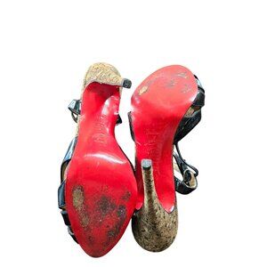 These elegant Christian Louboutin stilettos feature a black patent leather upper, a classic cork platform, and iconic red soles. Designed for a sophisticated appearance, they combine luxurious materials with timeless style for an elevated look. From my personal collection