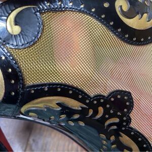 Black patent laser cut leather with gold mesh make up this striking Louboutin bootie.