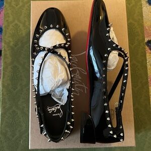 Elegant black patent flats with signature red soles. Adorned with edgy spikes for a bold look.