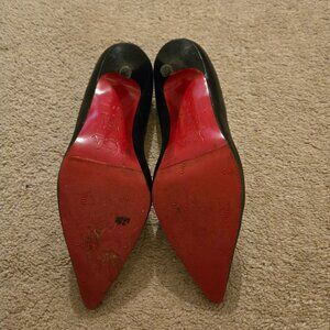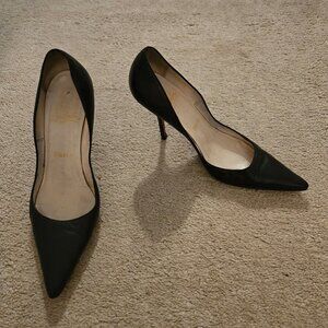 Classic Chrisitan Louboutin pointy toe pumps. Matte black leather upper with the signature red sole. Size 38. 4.25" heel.