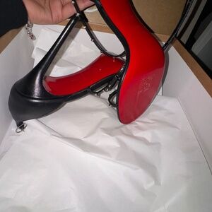 Elegant black heels with signature red soles. Sleek design with thin straps.