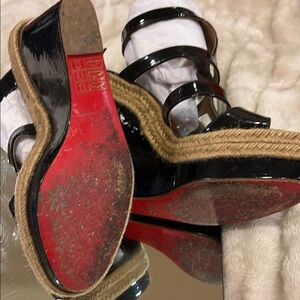 Christian Louboutin Black patent leather and Brown Woven Wedge Sandals