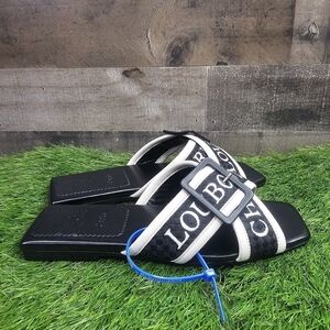 Christian Louboutin Black/White Logo Canvas and Leather Crossimule Flat Slides