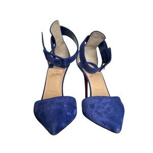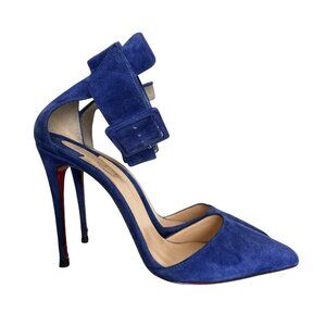 Elegant blue heels with signature red sole. Features ankle strap with buckle.
