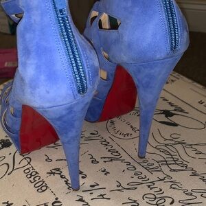 Elegant blue strappy heels with signature red sole. Perfect for stylish outings. Pre loved