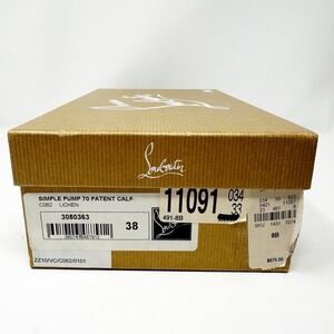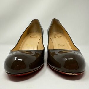 Elegant brown patent leather heels. Signature red sole. Classic round toe design.
