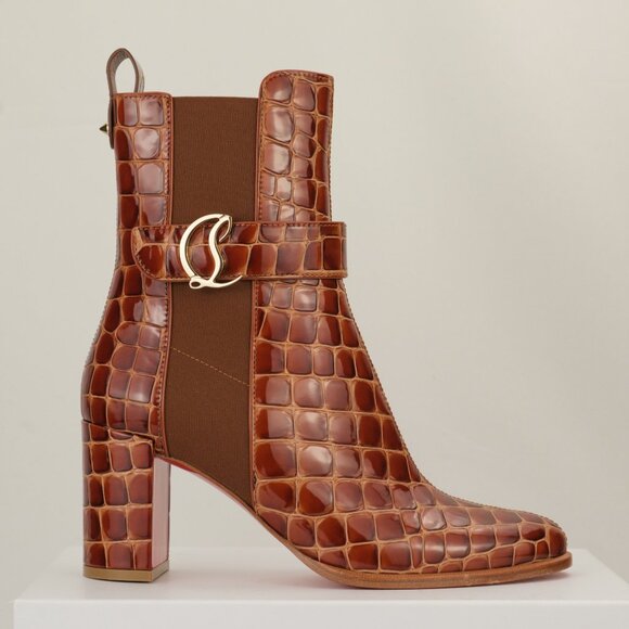 A refined take on a timeless classic, the Christian Louboutin CL Chelsea Calf Ali Boots showcase the brand’s signature balance of sophistication and edge. Crafted in acajou brown alligator-embossed calfskin, these ankle boots feature a sleek almond toe and elastic side panels for effortless wear. The 70mm block heel adds comfortable elevation, while the gold-tone CL monogram and signature spike detail at the heel tab lend an unmistakable Louboutin touch. Perfect for polished daywear or evening refinement, these boots are a luxurious staple with enduring style.