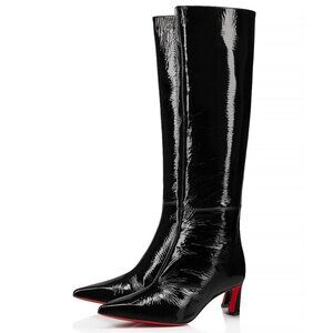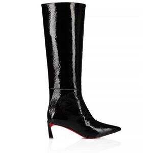 These pull-on boots feature a signature red sole and a pointed toe. The heel measures approximately 2.5 inches/ 55mm.