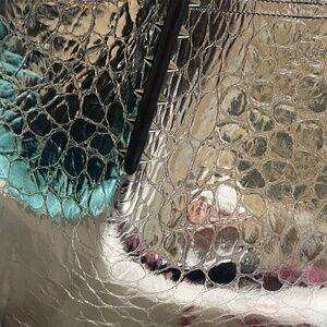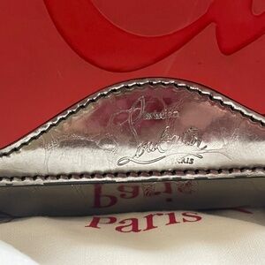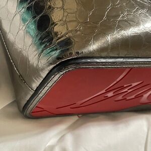 Christian Louboutin Cabarock anthracite silver alligator embossed large tote bag in calf leather with striking silver spikes. This has two top handles that means it can fit comfortably on your shoulder or crook of your arm, it has a solid rubber base with the Louboutin logo so it is stable when sat on the floor. This is a large tote so will hold all your everyday needs, internally there is lipstick red lining and a silver clip fastening. This comes with original dust bag. Bag has some small scratches through wear and tear.