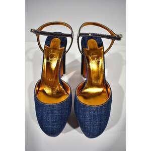 Christian Louboutin Coluna Pump 130 Denim Blue Gold Ankle Strap Platform Heel 41