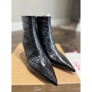 Step into effortless sophistication with these brand new Christian Louboutin Condora booties in striking gunmetal grey. Crafted in Italy from embossed crocodile-effect leather, these sleek slip-on ankle boots feature a pointed toe and a chic 55 mm slanted mid heel that offers just the right balance of elegance and all-day comfort.