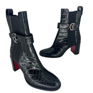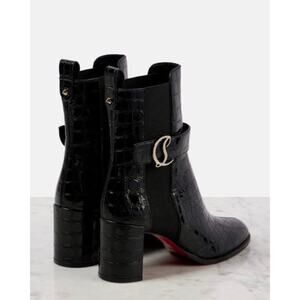 A striking and timeless Christian Louboutin boot crafted in glossy crocodile-embossed calfskin leather. This elevated Chelsea style features classic gored panels, a round toe, and a sculpted block heel for comfort and lift. Finished with the signature red lacquered sole, logo ankle buckle, and premium Italian craftsmanship. A statement designer boot perfect for fall and winter styling, capsule wardrobes, and chic everyday dressing. Made in Italy.