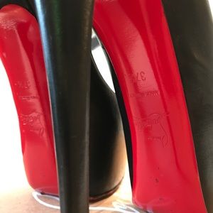 Beautiful pair of highly sought-after Louboutin Daffodile!! Black leather with platform heel. Very good condition! Only worn a few times, however as we all know, the Louboutin red soles scratch very easily...therefore the bottom looks more worn then they actually are. A shoe smith can easily repair the scratched sole. Otherwise GREAT condition!! Comes with original box.